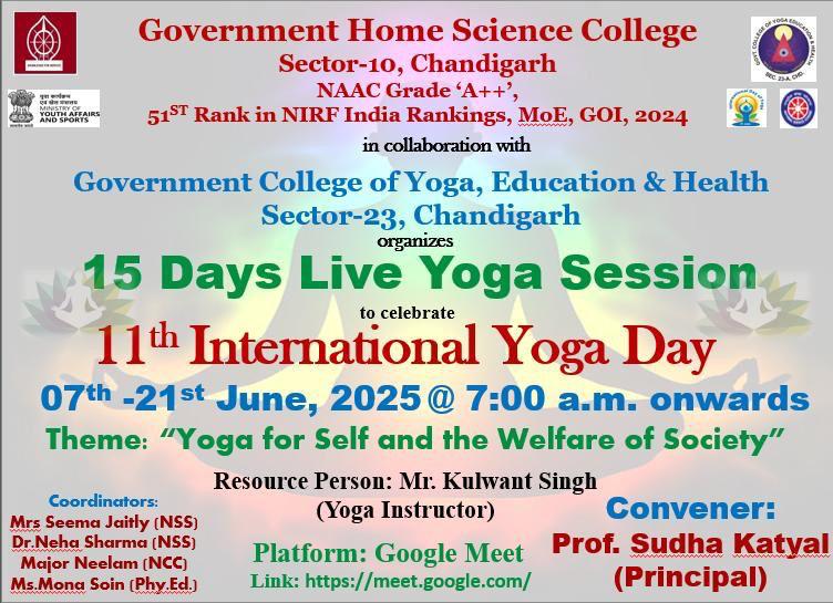 As a prelude to International Yoga Day on June 21, Government Home Science College, under the visionary leadership of Principal Prof. Sudha Katyal, commenced 15-days live yoga session on June 9, 2025. The program is being organized in collaboration with Government College of Yoga, Education and Health, Sector 23, Chandigarh.