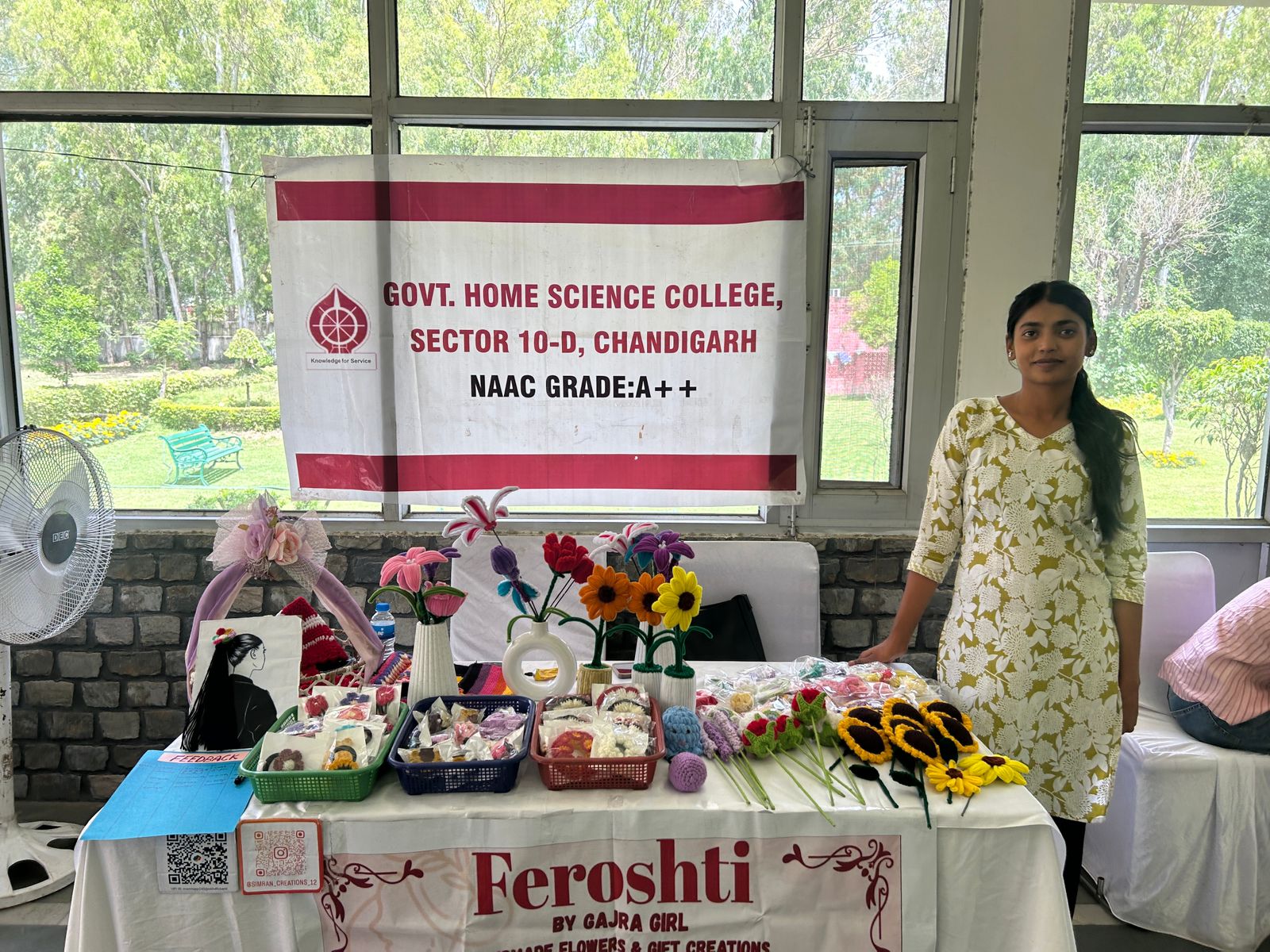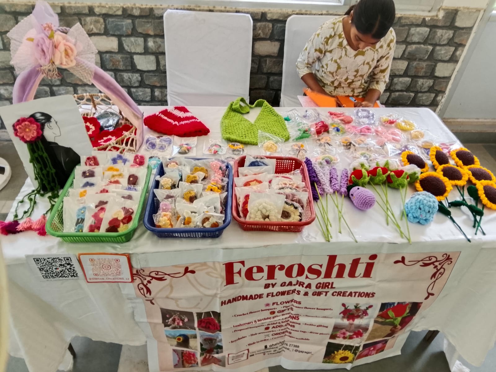 Setting up their stall under the brand “Feroshti,” the students displayed an attractive range of handmade products including crochet items, handmade flowers, purses, hair accessories, and other artistic creations. Their stall drew significant attention for its craftsmanship, uniqueness, and aesthetic appeal. The students are running their own online startup under the same brand name and earning while learning the skills at the college.