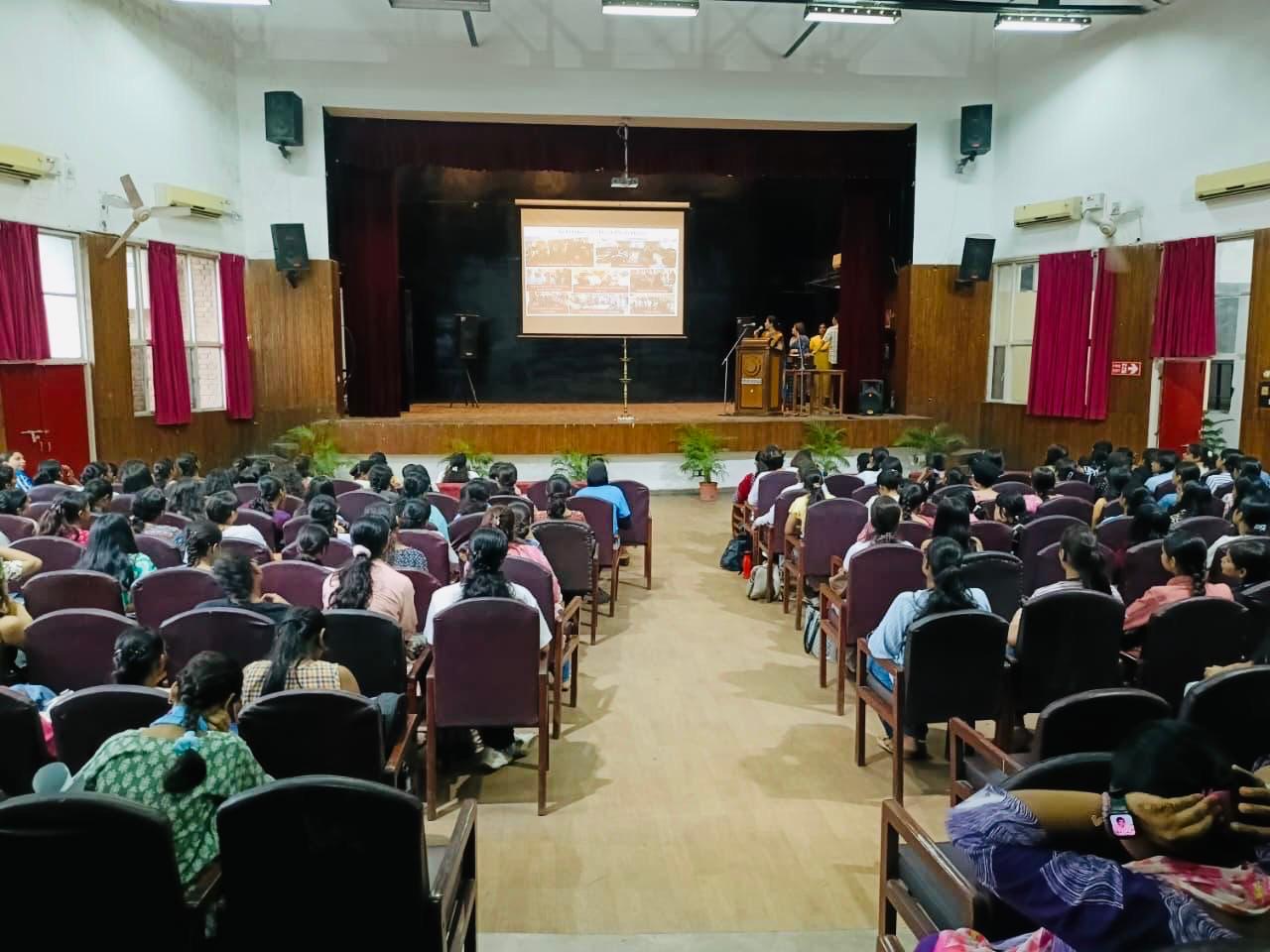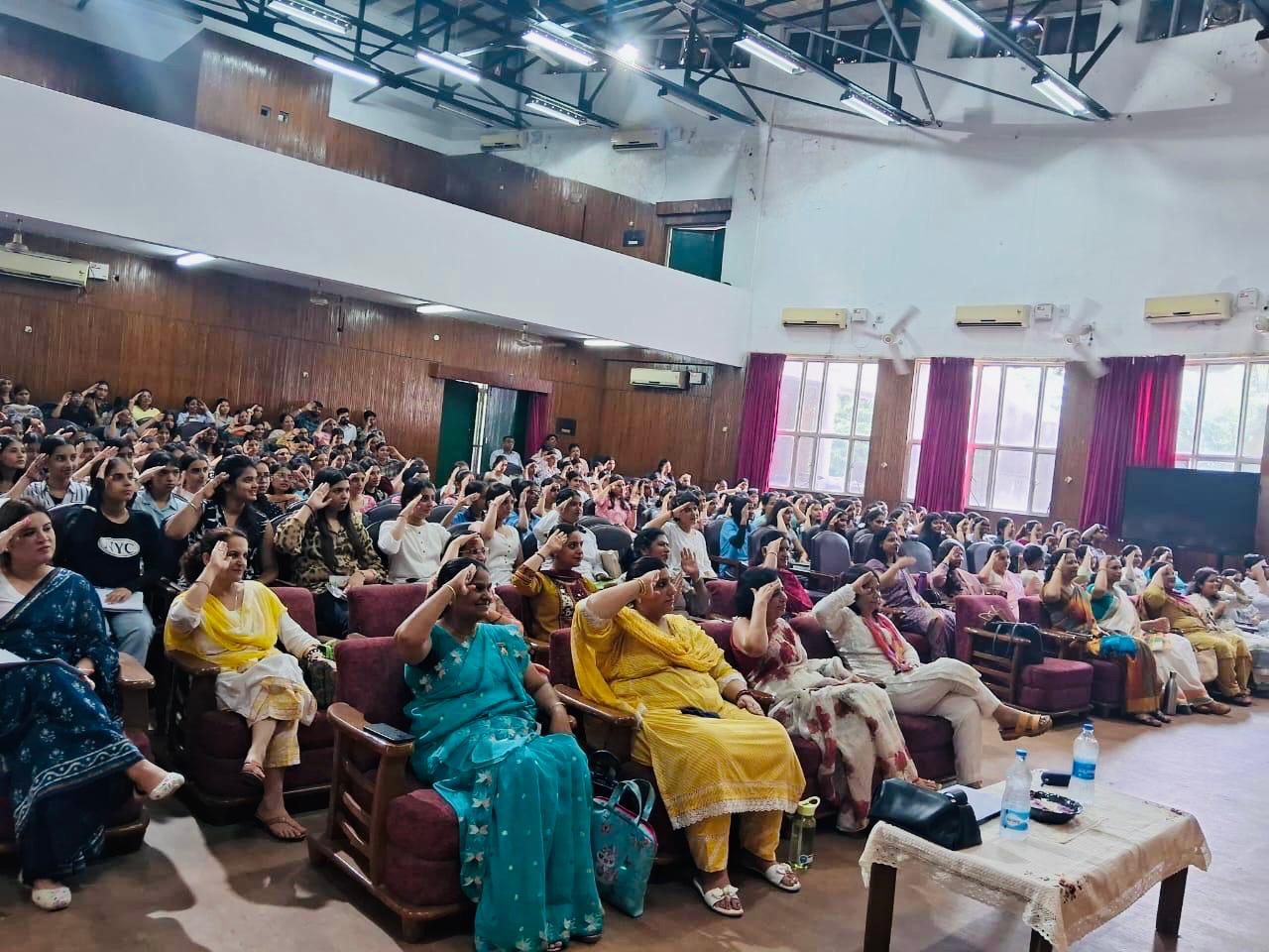 The programme commenced with a heartfelt welcome address by the Honourable Principal, Prof. Sudha Katyal, who underscored the importance of academic excellence, personal growth and community engagement. She encouraged students to actively participate in both curricular and co-curricular activities to ensure holistic development. Prof. Katyal also highlighted the relevance of the National Education Policy (NEP) 2020, describing it as a progressive framework that aligns perfectly with the college’s mission to deliver a holistic, flexible, and multidisciplinary education.