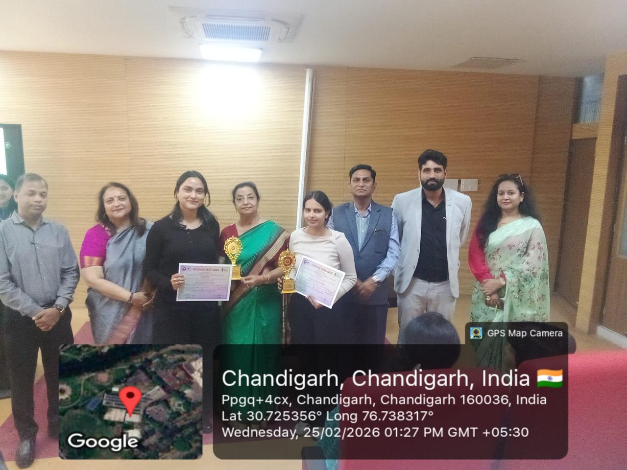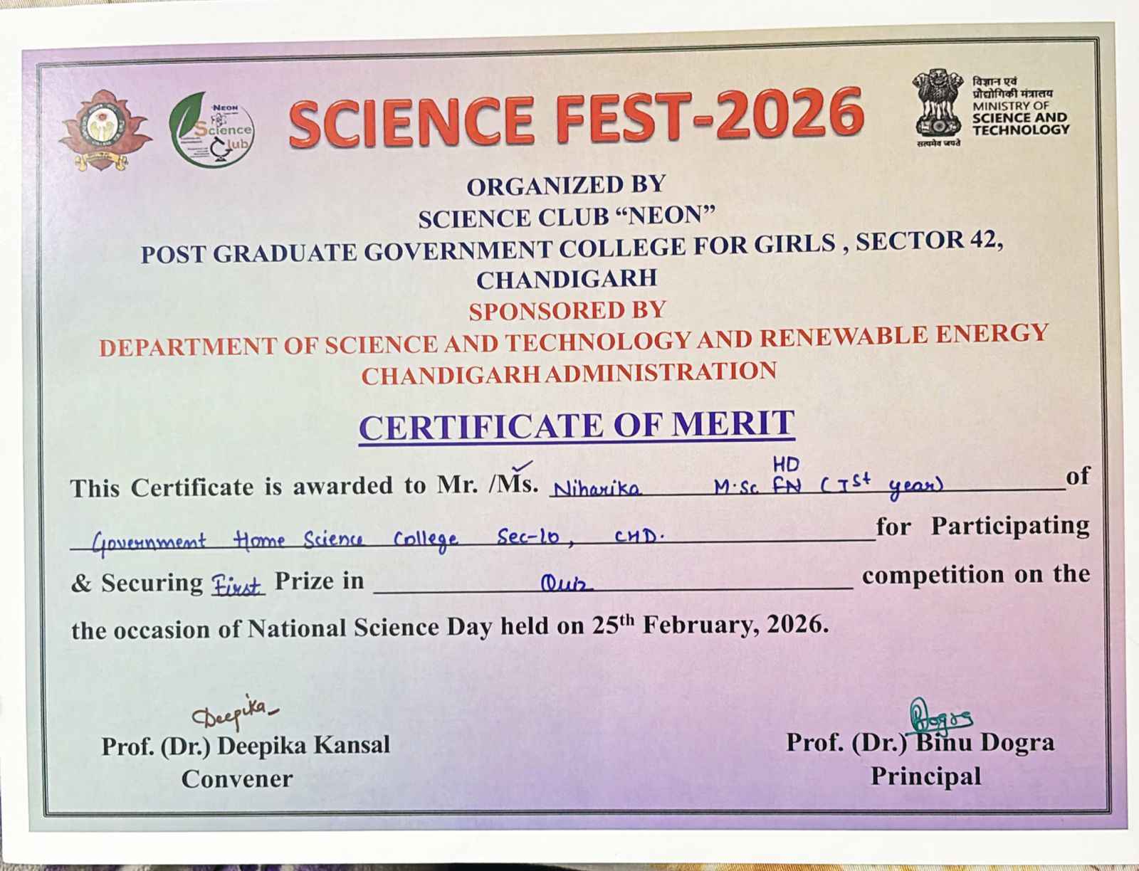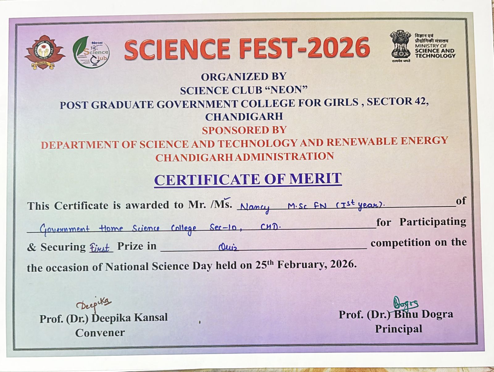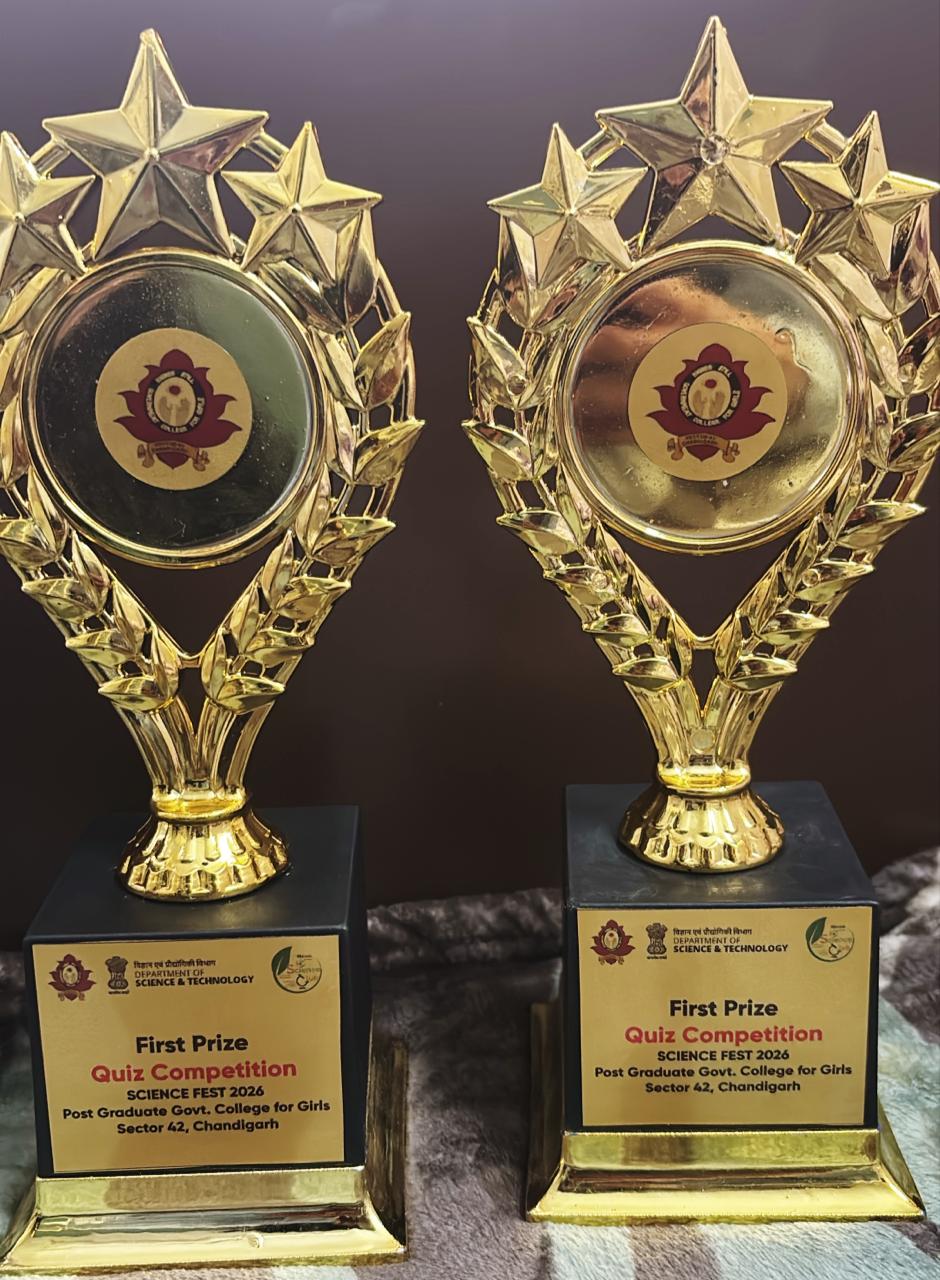 Nancy and Niharika from M.Sc. Home Science of Government Home Science College, Chandigarh brought laurels to the institution by securing First Prize in the Science Quiz Competition at Inter College Science Fest organized by the Science Club “Neon” of PGGCG-11 on February 25, 2026.