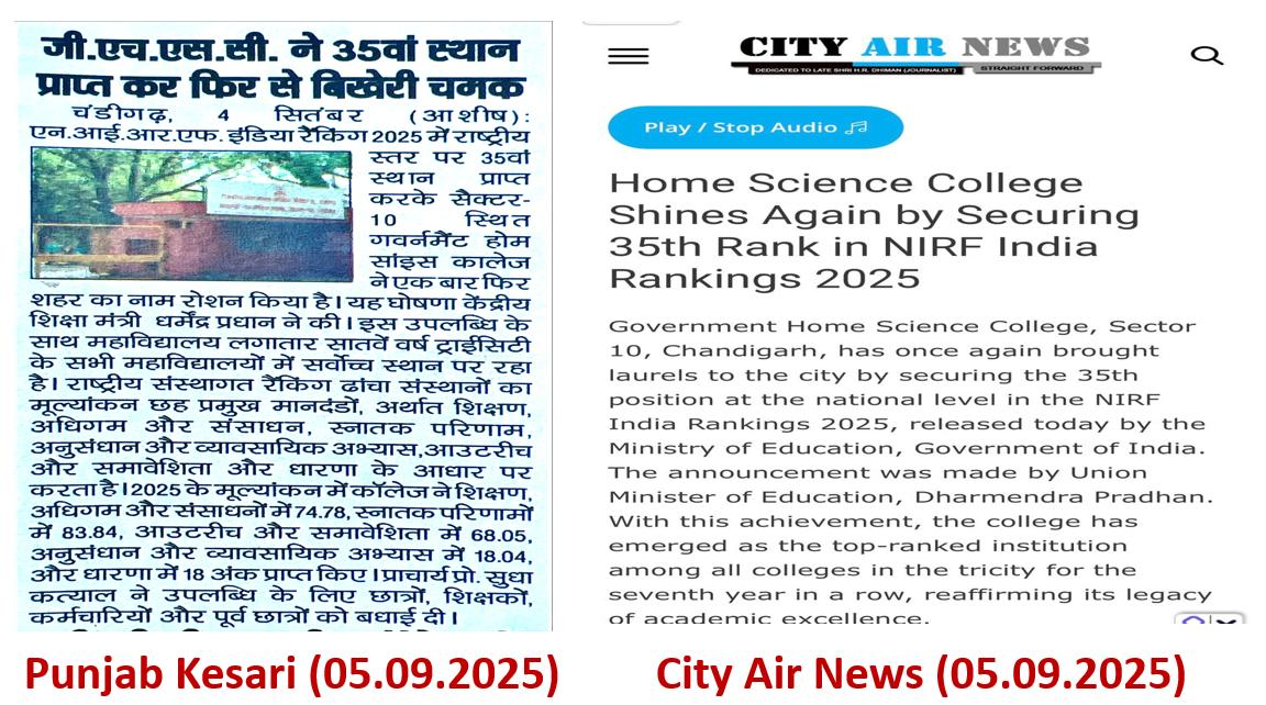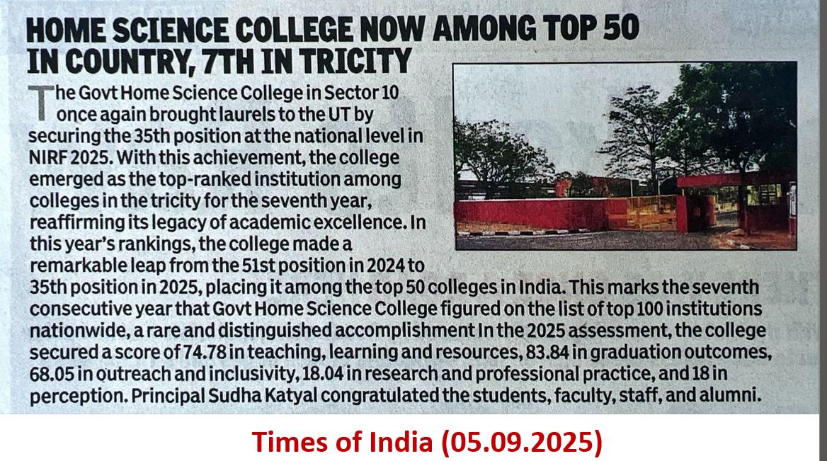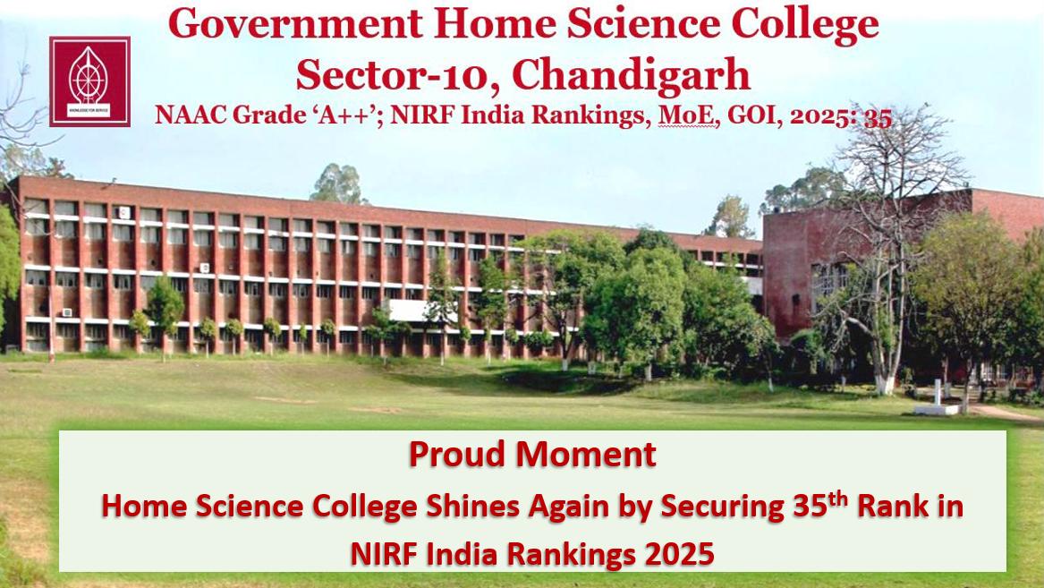 Government Home Science College, Sector 10, Chandigarh, has once again brought laurels to the city by securing the 35th position at the national level in the NIRF India Rankings 2025, released today by the Ministry of Education, Government of India. The announcement was made by Honourable Union Minister of Education, Shri Dharmendra Pradhan. With this achievement, the college has emerged as the top-ranked institution among all colleges in the tricity for the seventh year in a row, reaffirming its legacy of academic excellence.