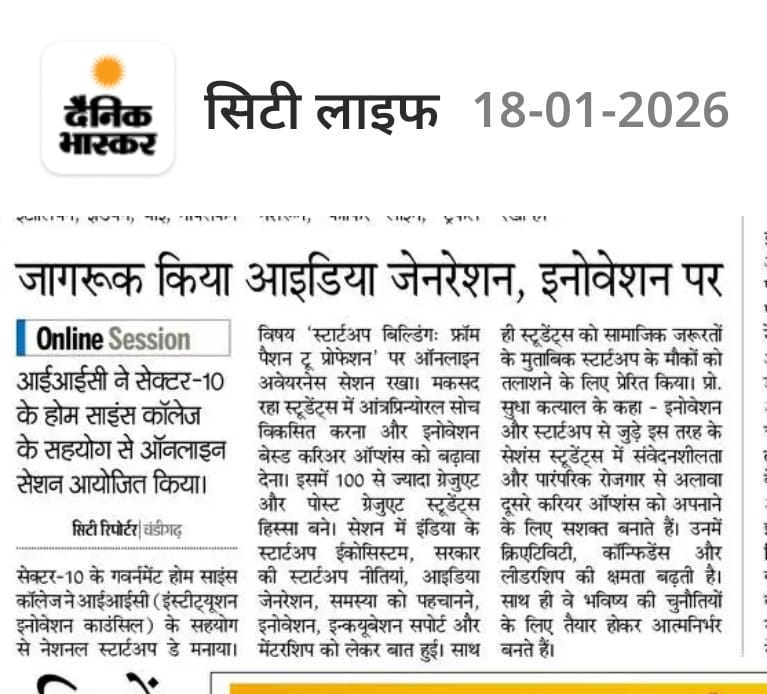 Government Home Science College, Chandigarh celebrated National Startup Day by organizing an online awareness- session on Startup building-From passion to Profession- under the aegis of the Institution’s Innovation Council (IIC). The programme was conducted for undergraduate and postgraduate students with the objective of fostering entrepreneurial thinking and innovation-driven careers.
