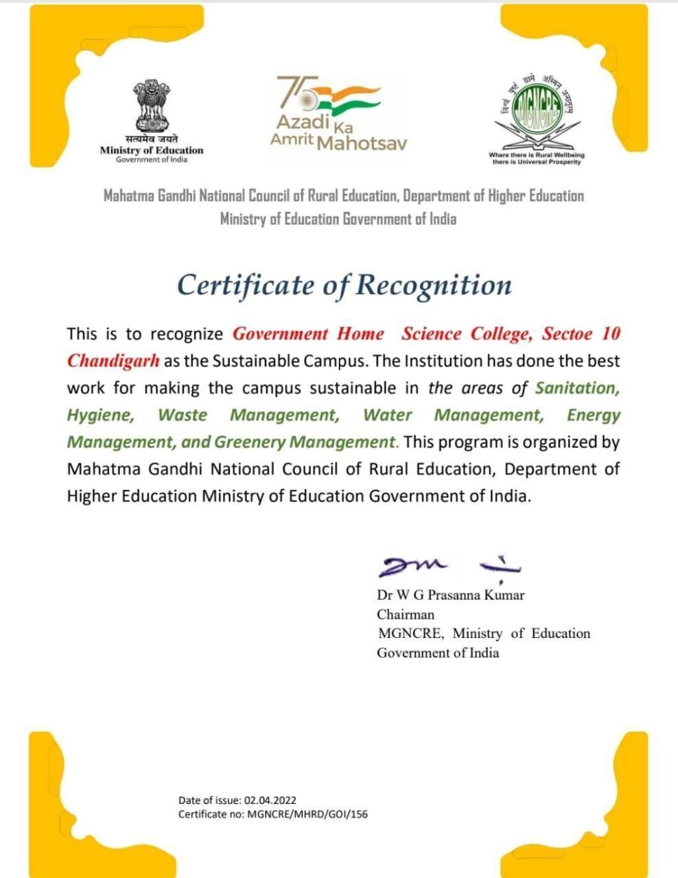 Under the able guidance of our worthy Principal Ma’am, Prof. Sudha Katyal, Government Home Science College has received once again recognition as the Sustainable Campus. The institution has done the best work for making campus sustainable in areas of Sanitation, Hygiene, Waste Management, Water Management, Energy Management and Greenery Management from Mahatma Gandhi National Council of Rural Education, Department of Higher Education, Ministry of Education, Government of India.
