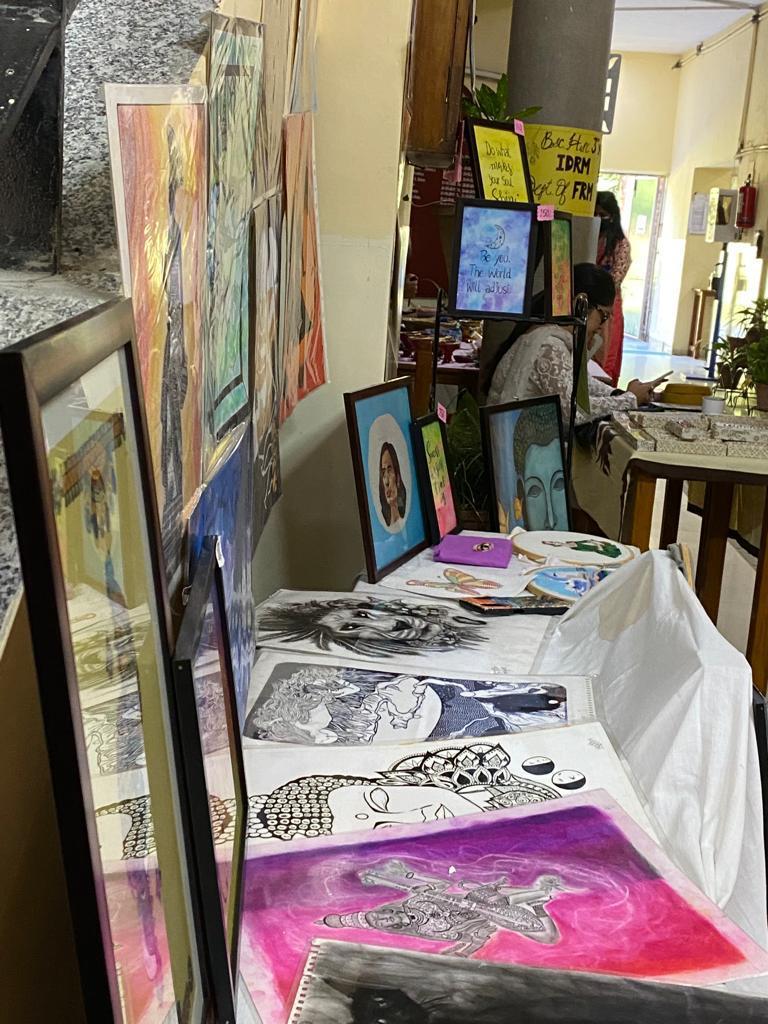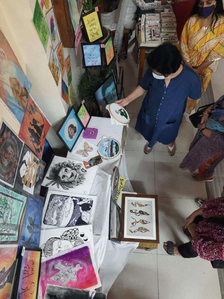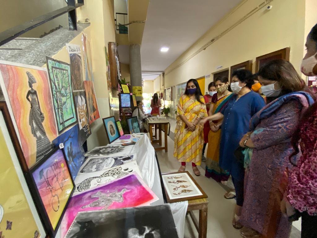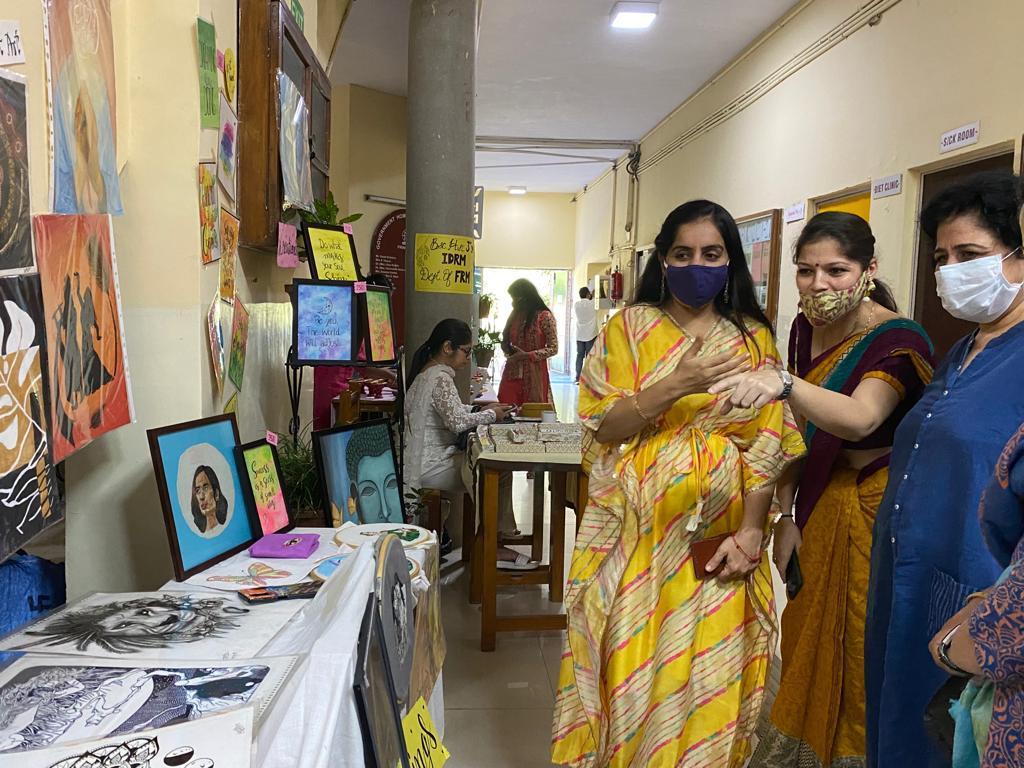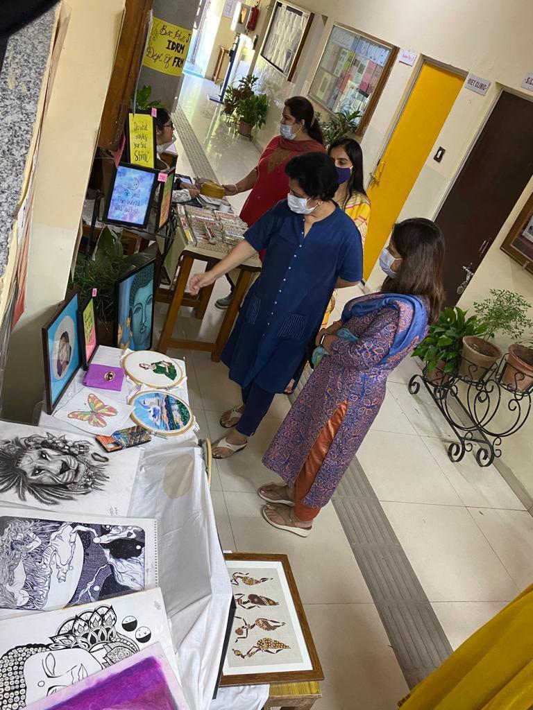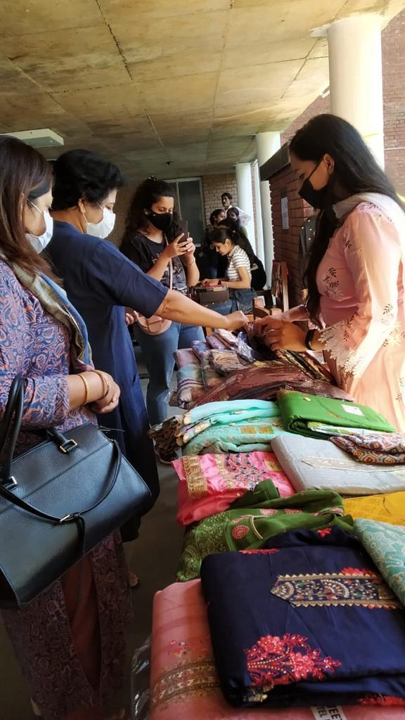 A stall displaying Ganpati ji 's, Torans and Floaters, decorative Diya’s was put up by the students of the Department of Arts. Bright and vibrant colors formed the theme of the exhibition. The students from different departments put up various stalls which encouraged start up initiatives ranging from chocolates, muffins, sandwiches and other snacks to artificial jewellery, ornaments such as earrings, neckpieces, rings along with ceramic items and stylish bags. Mandala art paintings, suits & hand painted dupattas & bags were the centre of attraction. Post graduate students of Department of Foods and Nutrition served nutritious snacks such as Bhel puri & grilled sandwiches, healthy muffins & chocolate cakes. A great response was received from all the stalls as they experienced a brisk sale and were sold out.