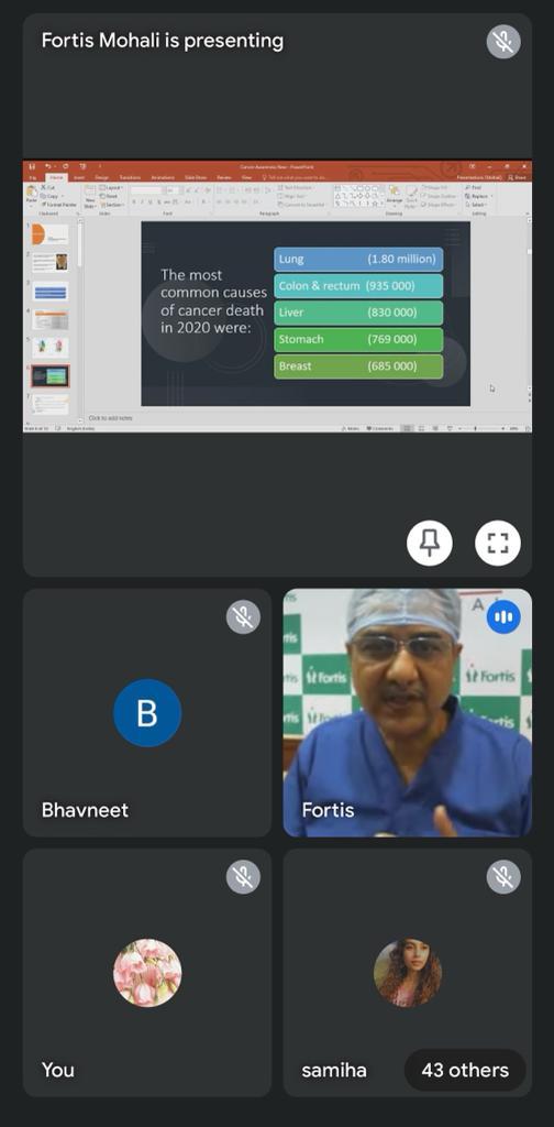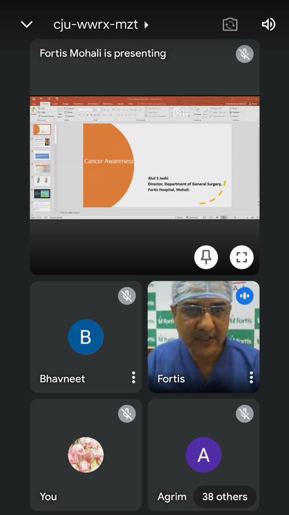 The expert speaker was Dr. Atul Sharma, Director General Laproscopic and Breast Cancer surgery, Fortis Hospital. He spoke about the importance of early detection in Cancer and the etiology behind it. The speaker emphasized upon need of screening and following a healthy diet and exercise routine to help manage the disease better. The webinar was attended by the faculty and students of the college.