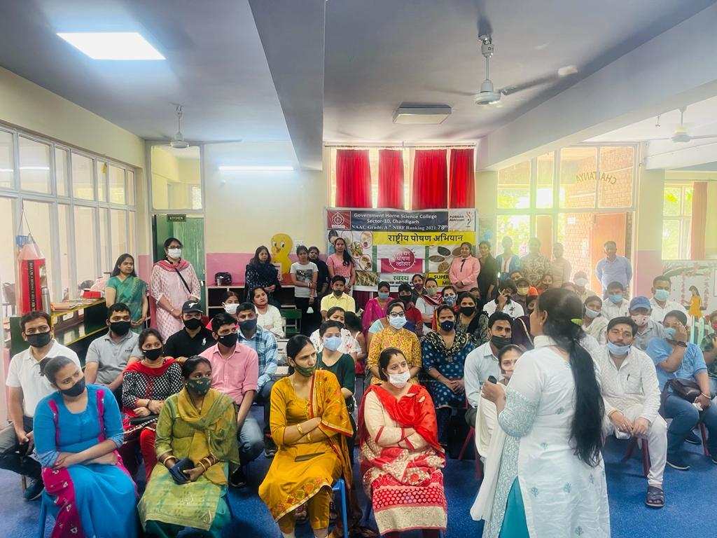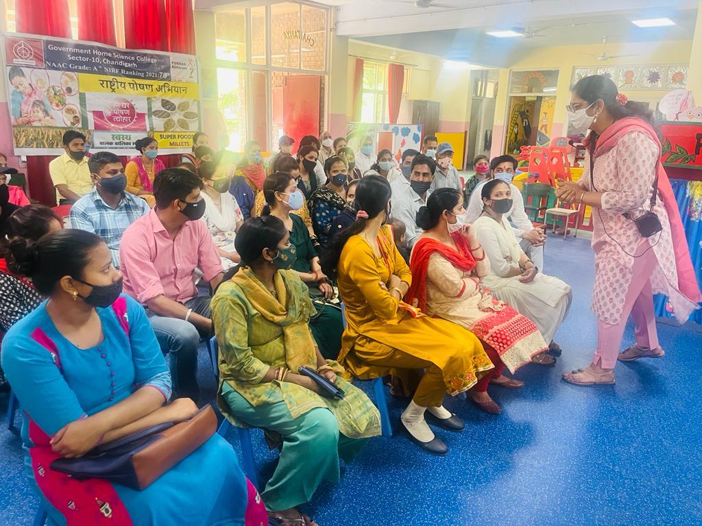Home Science college kick started celebration of Poshan Pakhwada by organising a talk on the Importance of good nutrition to achieve milestones of development for parents of Chaitanya Nursery School. Emphasis was laid on inclusion of millets in the diet of young children. Easy yet cost effective nutritive recipes were shared and Height and weight of children were also measured. Principal , Prof. Sudha Katyal encouraged the parents to include millets in various interesting forms in children’s diet to make eating a fun yet healthy activity for children. Activities to enhance holistic development were also demonstrated and concerns of parents regarding nutrition were addressed.