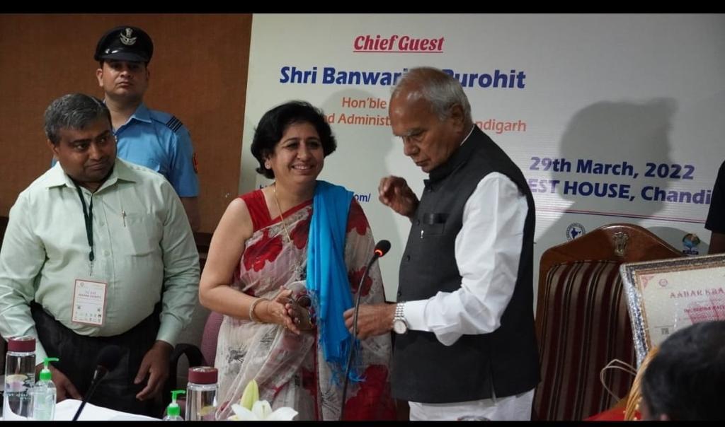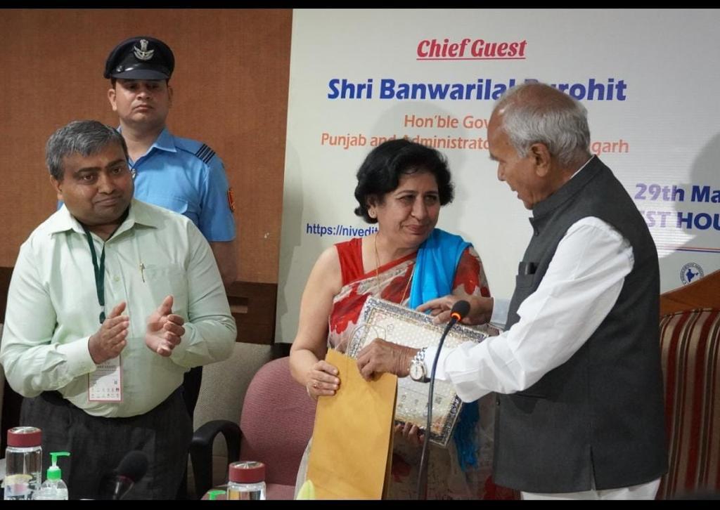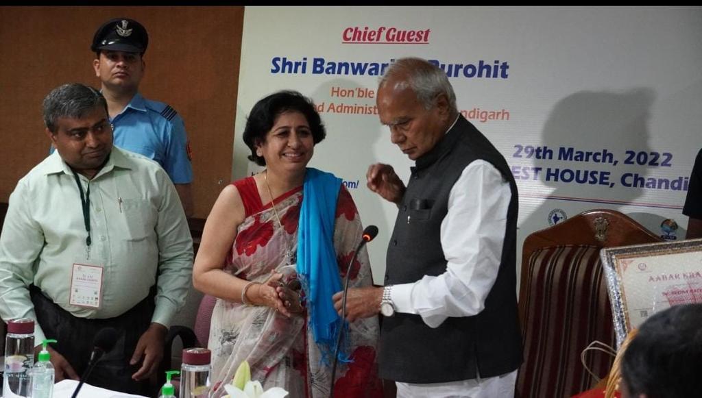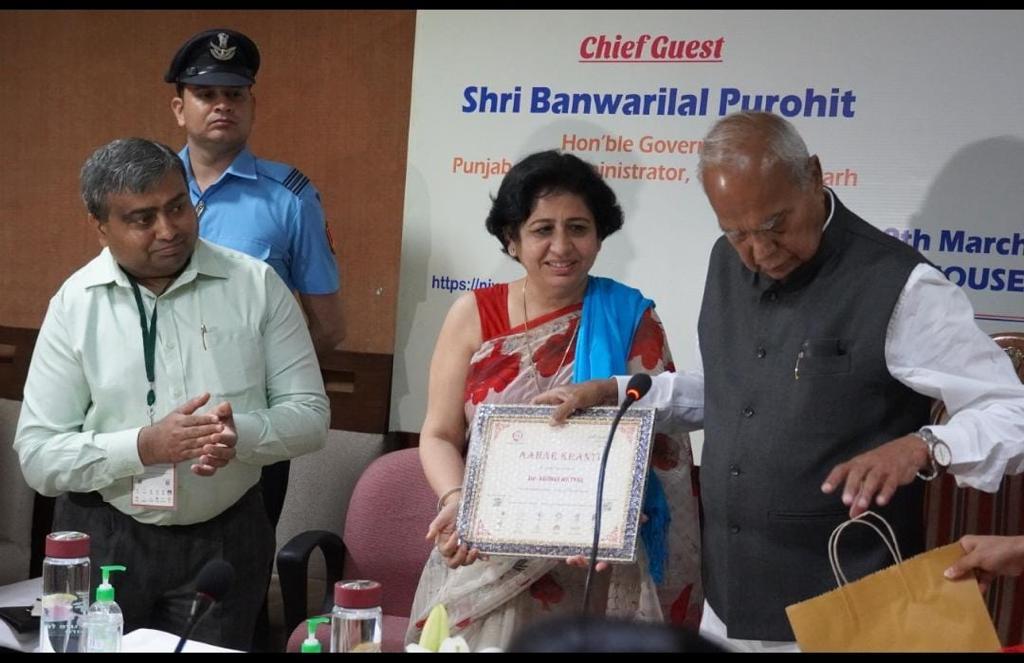 It is indeed a moment of great pride and honour that the Principal of the college, Prof. Sudha Katyal, was felicitated by the Honourable Governor of Punjab and U.T. Administrator Sh. Banwari Lal Purohit on 29.03.22 for her significant contribution in disseminating as well as implementing the motto of Aaha Kranti among the various stakeholders. She has been working relentlessly towards providing technical and logistical support for the Aahar Kranti project with a mission of promoting the use of millets through videos, pamphlets, interactive sessions, rallies and many other related activities. The rationale was to reach out to the masses and apprise them about the nutritional benefits of adopting a healthy lifestyle in their day to day life.