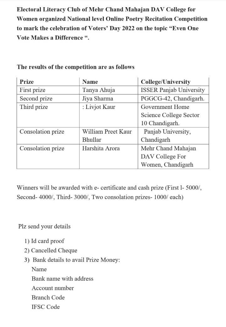 Livjot Kaur of B.Sc. Home Science 1st year bagged 3rd prize of Rs 3000/ in National Level Poetry Competition to mark the celebrations of National Voter’s Day 2022 on the theme ‘Even One Vote Makes A Difference’ organized by Electoral Literacy Club of MCM College, Sector-36, Chandigarh. Principal of the College, Prof. Sudha Katyal congratulated the student and her mentor.