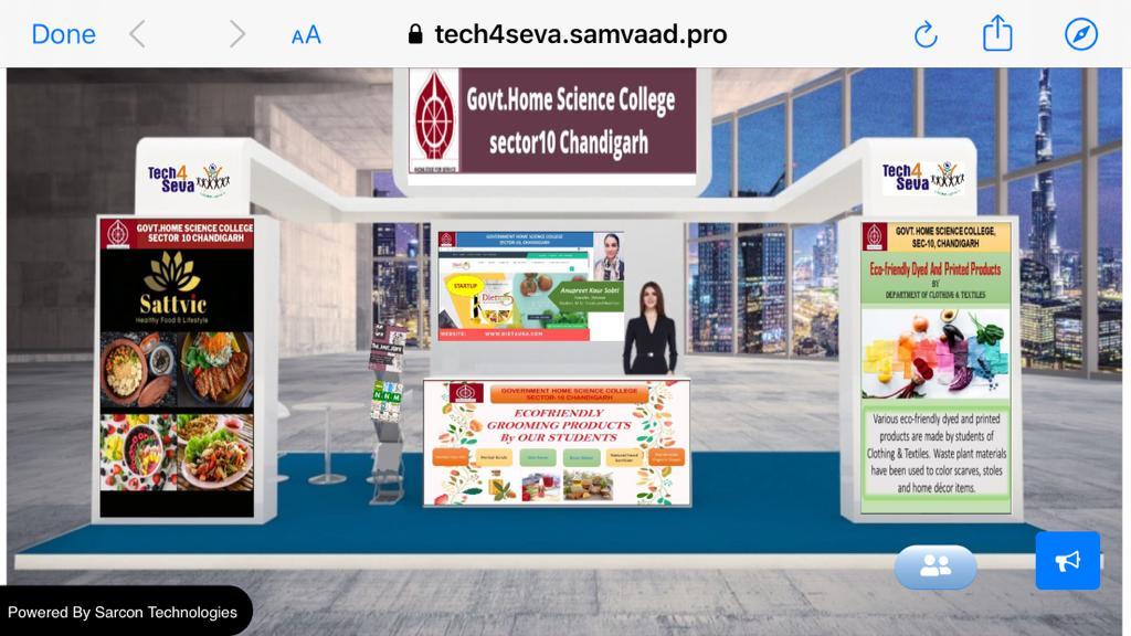 Government Home Science College Chandigarh actively participated in four day Virtual Summit TECH4SEVA organised by Vijnana Bharti (VIBHA), Unnat Bharat Abhiyan (UBA) and Centre for innovation and Bio Design (CiBiOD), PGIMER, Chandigarh from Oct 20- 23, 2021. The college exhibited it's virtual stall in this four day online expo based on the theme of Atmanirbhar Bharat, environmental friendly, and sustainable technologies, affordable health care and technology for good agricultural practices. The virtual stall of the college exhibited the seven different innovative startups run by the college students and alumna. The college stall attracted a large number of delegates out of the 24 total virtual stalls in the exhibition. Approximately more than 500 visitors visited the virtual expo.